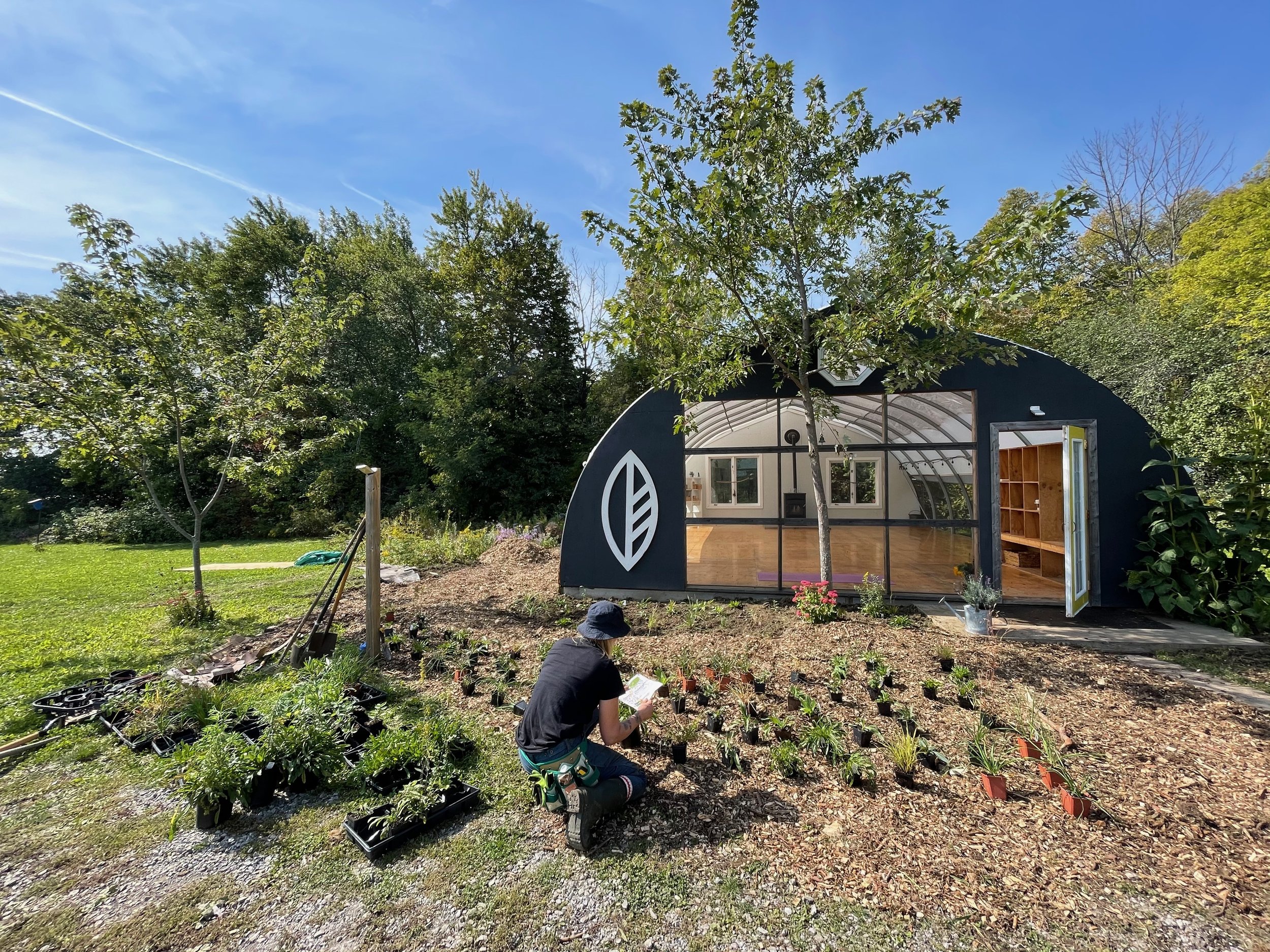 The Studio, is bermed into the top of the hill, while the front offers sunny, expansive views of rolling hills through our 10-foot, floor-to-ceiling, high-tech windows. You feel as if you are sitting out in a high, open meadow and indeed foxes, turkeys and deer occasionally walk by. Berming is the technique of totally or partially covering a building in earth to take advantage of the temperature of the earth, 55 F or 13 C., through all seasons. Our studio also has radiant-heated floors, which can adjust to the required room temperature. There is a living “green roof” over the studio.